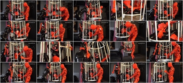 Latex Lara and a rubberboy having fun with Lola Noir while she is in her little birdcage