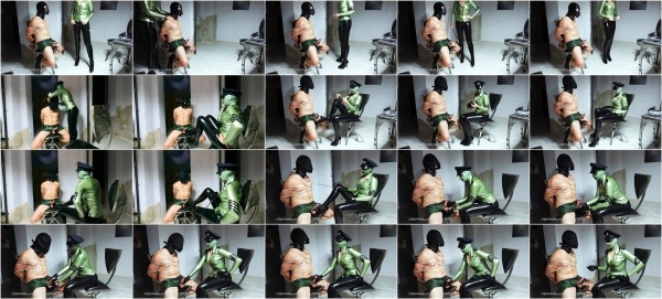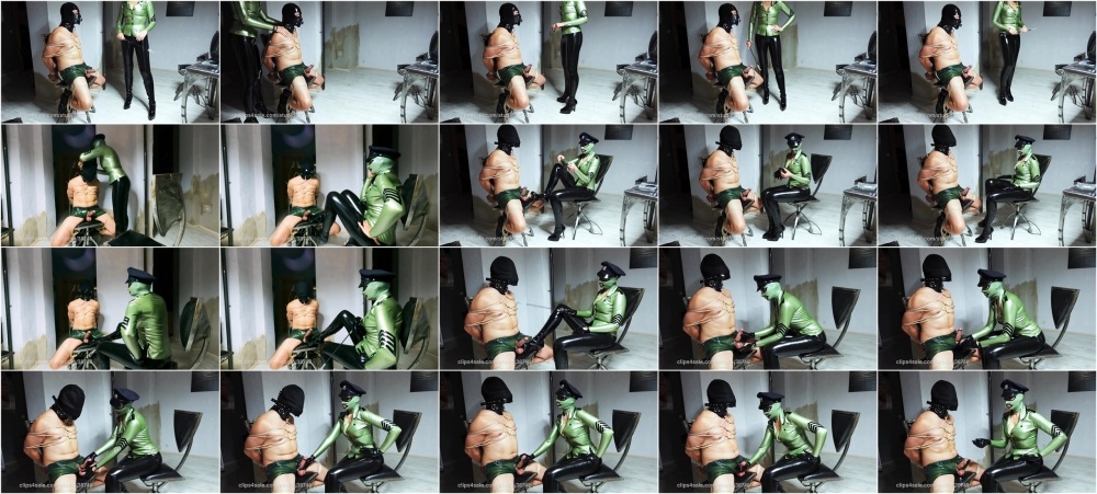 Deep down in my girlfriend’s underground basement system my prisoner is waiting gagged and tied to a metal chair. He is wearing a pair of semi transparent green latex shorts and his cock and balls are all exposed. There is a rubber ring around his balls, his shaft and also his glans. He has been sitting for hours in the darkness when I finally approach him in a full rubber military attire.