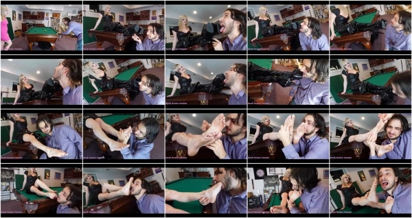 Sage Pillar and Bambi have been competitive friends for as long as they can remember, but tonight Sage is determined to get revenge. When Bambi invites her over for a game of pool, she is confident that she will finally beat him. However, Bambi's skills are still superior and he easily defeats her. Frustrated and irritated, Sage takes her pool stick and hits him on the head with it. After a few minutes, when Bambi has recovered from the blow, he sees Sage sitting on the pool table dressed in a dominatrix outfit! She orders him to lick the dirt off her leather boots as punishment for not going easy on her earlier. Bambi is shocked but feels compelled to obey her. Sage then demands that he take off her boots to reveal her sweaty feet! She wants a foot massage to make up for losing at pool. Reluctantly, Bambi begins rubbing her feet vigorously - just how she likes it. But Sage isn't finished with her punishment yet; she wants his tongue all over her sweaty, wrinkled soles! He obediently licks up and down her arches like a good little foot bitch! Sage even manages to stick all five toes into his mouth, making him gag! Nothing like turning your friend into your own personal foot slave after a competitive game of pool!