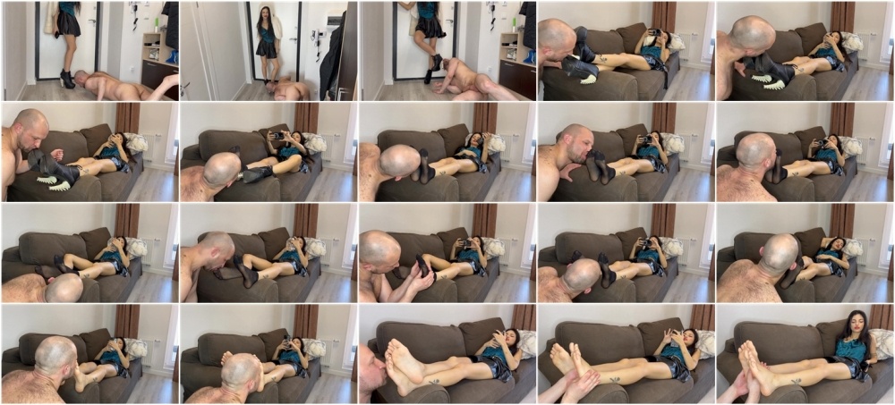 She glides to the plush sofa, reclining with regal grace, while her slave continues his task, meticulously cleaning her shoes as an act of worship. At her command, he gently removes her footwear, revealing her fragrant socks, still warm from her divine steps. With reverent obedience, he presses his lips to them, eagerly savoring the essence of her sweat, each breath drawing him deeper into submission. Her voice, a sultry melody of authority, urges him to worship more intensely, to prove his devotion.