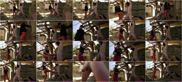 men at their genitals is of course a highlight for a thoroughbred sadist like me. My slave today is defenselessly fixed with spread legs and arms up. His dick is stiff and invites to be whipped. I start with my riding crop with which I whip his penis over and over again. In between I give him kicks into his manhood again and again. Slowly I really get going. Now it’s the turn of the dressage crop and cane. Every reaction caused by his pain and agony drives a smile into my face. Finally I give him some extra hard punches and his cock is clearly marked by the treatment.Verbal and physical take place, like in every clip with Mistress Katharina.