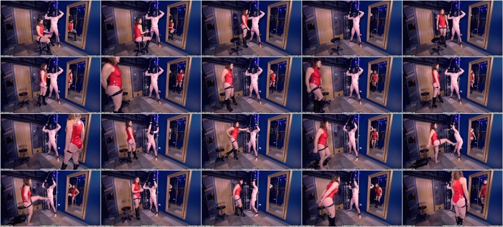 I had so many exquisite torments prepared for this slave, each one arranged with the precision of a sadistic ritual. Nothing about his suffering could be left to chance; the order had to be perfect. His cock still needed to function later, when I would make him to fuck another slave for my own amusement - not for pleasure, but to watch him humiliate himself under my gaze. That meant pacing my cruelty, leaving just enough time between the ballbusting and the bi play to keep him useful.But there were other considerations. His trembling stomach still needed to be fed a “meal” worthy of a pet: a bowl of canned puppy food that smelled faintly of despair. I toyed with the timing. Should I feed him first? Watch him lap it up like the he is, only to kick it out of him moments later? No. I wanted the food to stay down, to become part of him, to sit heavy in his gut as a reminder of what he is. So the plan was decided: break him first. Feed him after.He is bound in the corner of my dungeon’s scaffolding frame, his body stretched wide by spreader bars and suspension bars that turn him into a helpless display. His scrotum hangs exposed as a vulnerable, trembling offering for my boots.I stalk him slowly, dressed in a skin-tight latex bodysuit, fishnet stockings tracing lines of power down my legs, and patent knee-high boots gleaming under the dungeon lights. My presence alone crushes his breath. I whisper my intentions into his ear, sharp little promises of what’s coming, mixing taunts with false starts that make him jerk and shudder. He knows he’s prey, but he doesn’t know when the predator will strike.And then I do. My boots hammer into him, merciless and precise, crushing his balls again and again until sweat pours off him, his body convulsing with pain and fear. He gasps, trembles, almost collapses, but I don’t let him. The only thing that saves him from complete ruin is my desire to use him later.
