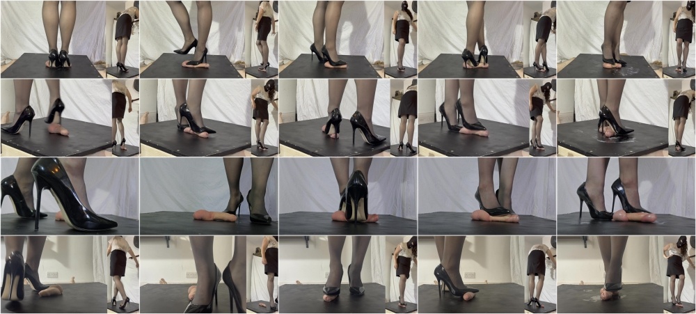 Full HD video - 4 version value pack containing the following: 1) Sexy legs cam + Full body split video 2) 45 degree plus full body split video 3) super close high res 4) New and improved POV cam + full body split.All four of these versions can be seen in the preview.A Brutal Cock and Ball trampling shoejob under my sharp black patent high heels, with a huge cumshot. I'm wearing one of my real work outfits that I would wear in my office job.DESCRIPTION:You have been called into a meeting with your boss, Miss Dolores. She is dressed in her usual work attire - a sexy, slim-fitting formal skirt, smart dress shirt, dark opaque nylons (tights!) and of course, my black patent court shoes that you can't help but notice every time you see me.You've failed your annual review - and I'm not happy.You have been so lazy on the job and not met your targets. You will probably have to be let go from your job...Unless... I keep you around purely for my personal amusement. You will be my personal slave to vent my frustration from the board room. Unfortunately for you, today was a particularly stressful day and I need to make use of you.You will see lots of sadistic crushing of your cock and balls as I carelessly step around the board, taking no notice of where I step. This has the possibility of causing you some real damage, and your balls will be grazed over and over by my razor sharp heels.You will see me use the heels to cruelly torment your cock and balls, driving it into your flesh as you can only watch in dismay.Lots of full weight crushing, using both feet to flatten your manhood. You will also see lots of sadistic stomping and very painful twisting of your cock and balls like I'm putting out a cigarette.For the grand finale, I glide my sexy heels up and down the length of your lubed cock, while keeping your balls firmly pinned in place with my other foot. I don't allow you to enjoy it too much, as I deliver hard stomps and more merciless crushing every time you look like you're enjoying things too much.Eventually, the pressure becomes too much and the cum erupts out in a series of jets, which i pump out under hard and fast strokes of the smooth soles of these heels.****Edited version and 3 split camera versions coming this week. One will be released each day.
