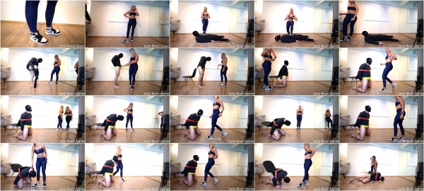 Queen Lytta appears in her tight gym clothes, looking dominant and sexy. She turns her slave into a literal workout tool — stepping on him like a human platform to get her reps done.