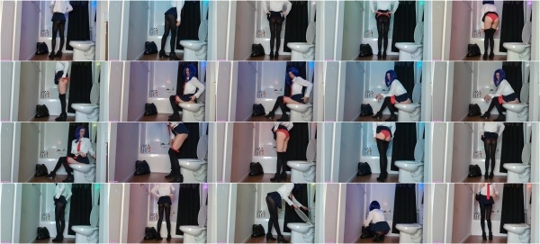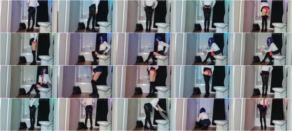 Sage Eldritch is cosplaying as school girl Raven. From your voyeur perspective, watch her enter the bathroom and walk over to the toilet. She is wearing her school uniform with dark pantyhose and ankle boots. After setting down her school bag, she pulls up the back of her pleated skirt, revealing her butt in panties and nylon underneath. After pulling down her pantyhose and then panties to her knees, she sits upon the toilet and relieves herself. After she's done peeing, she wipes and pulls her pantyhose and then panties back up and fixes her skirt. She then flushes the toilet, picks up her bag, and leaves the room.