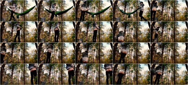 After a day of relaxing in her hammock out in the woods, it's time for Sage Eldritch to pack up and leave. She is wearing a hoodie, sunglasses, and with her hair up in a bun. Her ass is hanging out of her tight yoga pants, showing off a big buttcrack as she takes down her hammock. Watch as she packs everything up into her backpack and walks away with bare butt still on display as you hear the crunch of leaves under her black leather boots.