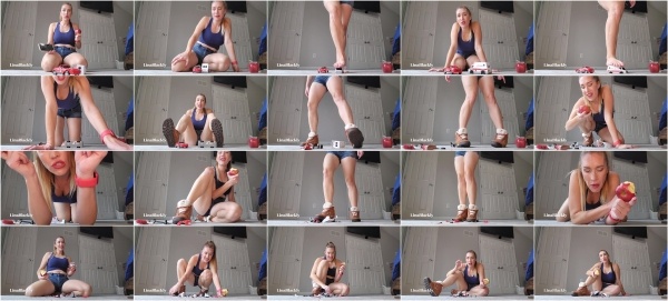Giantess finds your toys on the ground and gets upset. She is going to teach you a lesson by smashing your toy cards. Say goodbye to your precious cars. But first, she tells you that if you cry enough, she might not smash them, then teases you with her bare feet before putting on her giant boots to demolish them into little pieces, making the cars unrecognizable. Giantess licks the skin of her red apple and eats it while tormenting you as you cry.
