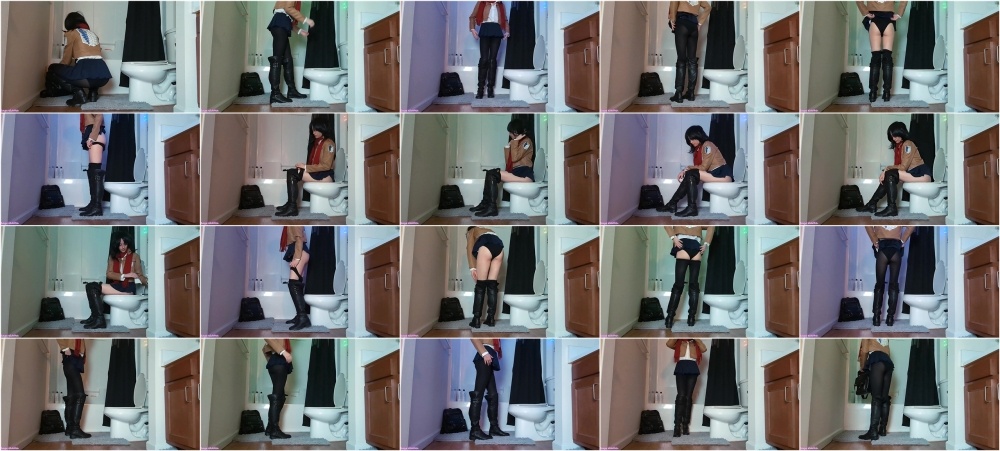 From your voyeur perspective, watch Sage Eldritch, costumed as Mikasa Ackerman [AoT], walk over to the toilet. She is wearing a school uniform with black pantyhose and tall leather boots. She pulls up the back of her pleated mini skirt, revealing her butt in panties and nylon underneath. After pulling down her pantyhose and her panties to her knees, she sits upon the toilet and relieves herself. After she's done peeing, she wipes and pulls her pantyhose and then panties back up and fixes her skirt. She then flushes the toilet and leaves the room.