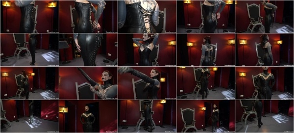 Watch Mistress getting dressed in her leather corset dress accessorize with leather neck corset and gloves.. enjoy her outfit!