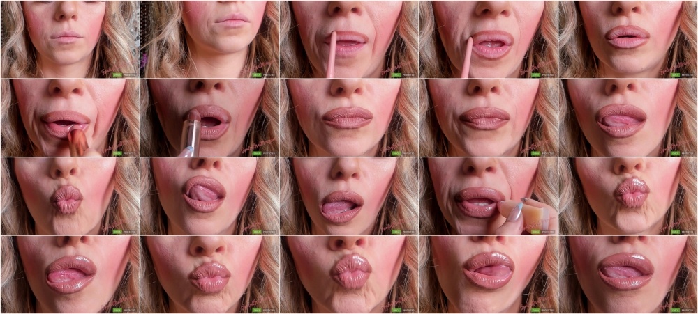 Applying brown lip liner and lipstick makeup with lip gloss and closeups of lip licking