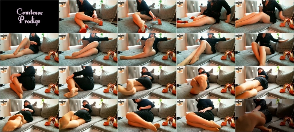 GlamWorship is pleased to offer this exclusive clip of Lady Comtesse Prodige. These Louboutins are beautiful, but the feeling of pure nylon fibers on my feet, legs and ass is much better! Lady Comtesse makes herself comfortable in her favorite tights and plays a little with them, She knows this will torment all you leg and foot worshipers, making you desperate to serve and inhale her goldly AROMA. ''Hmmm, pleasurable! A dream you should join!''