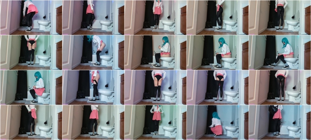 From your voyeur POV, watch Sage Eldritch, dressed as Bulma, enter the bathroom. She's wearing her pink dress and black pantyhose. After setting down her bag, she pulls up the back of her dress; then pulling down her nylon pantyhose. After pulling her panties down to her knees, she sits upon the toilet and relieves herself. After she's done peeing, she wipes and pulls her panties back up. Then after pulling back up and fixing her pantyhose and fixing her skirt, she flushes the toilet and leaves the room.