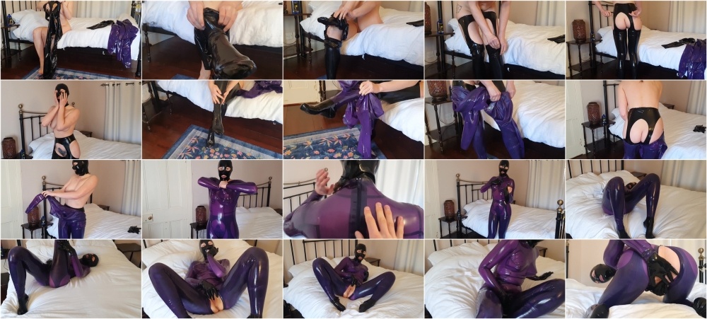 I lube up my body and slide on my latex stockings, then I zip on my hood. I put my catsuit on next, I love the way it slides over the stockings - layering latex really does feel incredible. Once my catsuit is zipped up, I add the final touches - my short rubber gloves. Now I’m dressed literally head to toe in latex! Moving my body creates such lovely rubbery sounds, and touching myself feels incredible too. I lie back on the bed and enjoy the sound of latex on latex and caress my body with my gloved hands. I unzip my catsuit crotch zip and ask if you’d like to see me cum… (Getting dressed up and wearing latex turns me on, so I hope you would have said yes, because touching myself is what I want to do!). I moan and make myself orgasm using my fingers.
