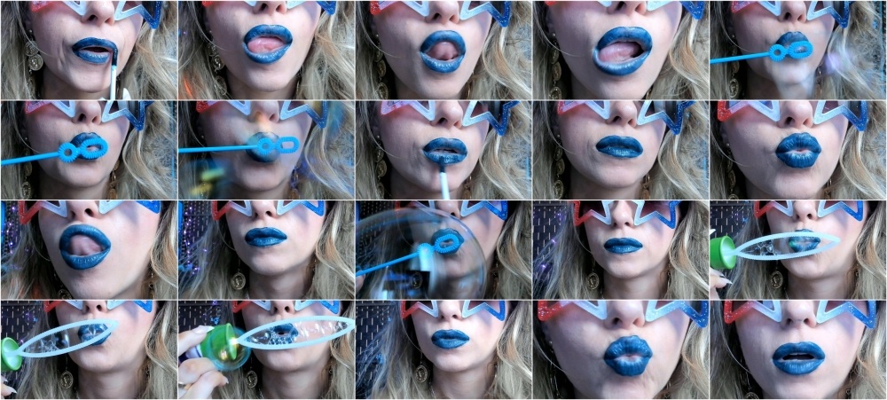 Extreme close-ups of lips applying blue lipstick makeup and blowing bubbles at the camera