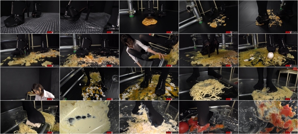 Experience Yua Hidaka's dominant display as she crushes an array of foods under her high heels and black pantyhose. Hear the crisp crackle of chips and rice crackers, and see the squish of eggs and tofu, all crushed in her miniskirt and stockings. With POV shots from below, witness the chaos of noodles, tomatoes, and tofu smeared under her feet. This visually striking crush fetish showcase highlights Yua's transformation from pristine to messily adorned in food remnants.