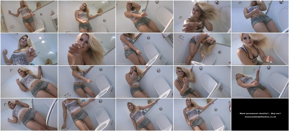 Beg me not to do it pity-boy. I want to hear you beg and plead me not to flush your key down the toilet. If I just drop it down the toilet and press the little button it's gone forever and your worthless little cock is imprisoned for the rest of your life. I would laugh so much watching it disappear knowing you're never going to be free again. Never to get hard again. Never to touch your crunched up little cock again. Never to feel a warm pussy ever again and never to cum like a real man again. I'll make you watch me drop your key into the toilet and destroy your sex-life forever. I'll make you watch and laugh at your panic, knowing I've just ruined your hope of freedom. So beg me not to do it loser - beg me and I might just change my mind. available in lower resolution iPod format- visit my other clip store