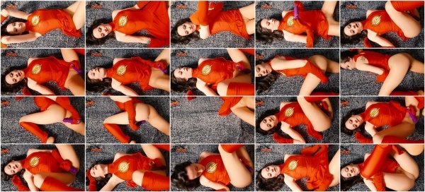 Sage Eldritch is costumed as Flash Girl in her tight red dress, gloves, and Wolford pantyhose. She has already taken off her mask and is laying back with her vibrator. She looks up at you as she pleasures herself through her sheer pantyhose until finally having a big orgasm.