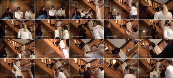 TIo e le mie amiche Gea e Scarlet stiamo chiacchierando sul divano, dal piano di sopra il nostro schiavo ci chiede di passargli un oggetto che si trovo su di una mensola vicino alle balaustre delle scale. Noi lo ignoriamo e poi gli diciamo che ci può arrivare benissimo da solo a prenderlo! Lui cosa fa? si sporge e resta incastrato con la testa tra le balaustre! Ridiamo tantissimo e decidiamo di cogliere l’occasione per tirargli un po ' di sonori schiaffi!ENMe and my friends Gea and Scarlet are chatting on the sofa, from the floor above our slave asks us to pass him an object that is on a shelf near the balustrades of the stairs. We ignore him and then tell him that he can very well get there on his own to get it! What does he do? he leans out and gets stuck with his head between the balustrades! We laugh a lot and decide to take the opportunity to give him some loud slaps!