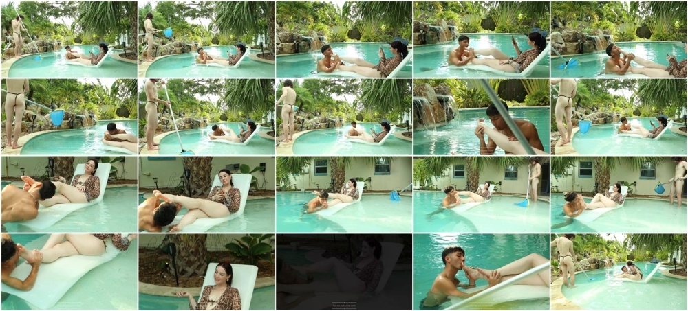 Two men, two duties.. each a curated offering to my comfort. As I lounge in the pool to enjoy the warm weather, one devoted submissive worships my feet while the other polishes the waters I drift beside. Every touch and task exists for my pleasure alone.