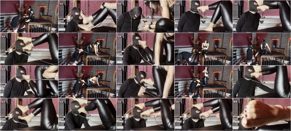 Eccolo li il mio schiavo. L'ho fatto uscire dalla gabbia dove normalmente lo tengo a mia totale disposizione e lo sottopongo a un trattamento sotto i miei piedi divini. E mio anima e corpo. L'ho ormai costretto a lasciare la sua vita normale e vive solo per me, in gabbia tutto il giorno. Dunque cominciamo: io seduta davanti a lui sulla gabbia. Uso solo i piedi che lui deve leccare, devotamente come gli ho insegnato, lavandoli con la sua inutile lingua. Poi bocca aperta e piedi che lo lasciano senza fiato, frugando quasi sin nella sua gola. Un piede in bocca e uno sulla testa. La catenella alla quale l'ho legato serve a muoverlo, perche sono io che decido e detto letteralmente i Suoi movimenti. Che belli i miei piedi, vero? Li sta assaporando pieno di eccitazione. Bene. Ora, con la dovuta delicatezza, mi infila le ciabatte. Che ne faro di lui oggi? Chissa. Forse stara ad aspettarmi tutto il giorno dentro la sua gabbia.