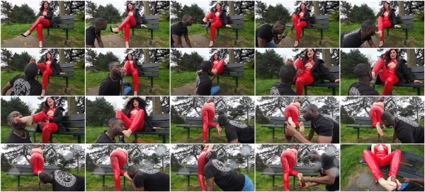 Miss Moree decides to entertain herself and instructs her deploreable foot mutt to work. Miss Moree demands her foot slut cleans her red bottom heels, already splattered in mud from the poor weather conditions outside.