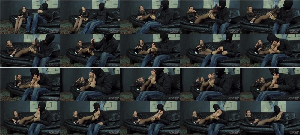 Mistress Anette lets her slave surprise her. She relaxes on the sofa with a cigarette and she tells him, he can do whatever he wants with her feet, but be nice, otherwise punishment comes. The slave sniffs her feet for a few minutes, then he rips open her pantyhose and he starts to lick her now naked feet with her wet tongue.