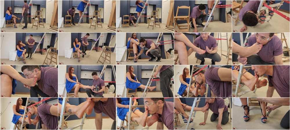 Kiffa is checking to see if the electrical work on her new apartment is complete. There's something wrong with the ceiling lighting. He tells her to climb the ladder to check if everything is correct. She climbs the ladder in her wedge sandals to get a better look. The foot pervert electricist enjoys looking at her perfect feet while she is looking into the ceiling. When Kiffa notices it, she asks him if he can do his work faster if she lets him worship her feet. He quickly fixes it to be able to worship Kiffa’s Feet. After realizing she has been tricked, Kiffa decides to make things difficult for the electricist by propping her feet up on the ladder so he can get under there and worship her feet.Kiffa is enjoying it, but she needs to go, so she asks the electricist to tie her wedges.