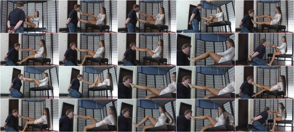 Mistress Amanda treats her slave brutally as she wants to try and make her naked feet into his mouth. Because he is not so good in swallowing all her toes, she helps it by yanking his leash and pulls him closer and closer while her feet is inside his mouth.