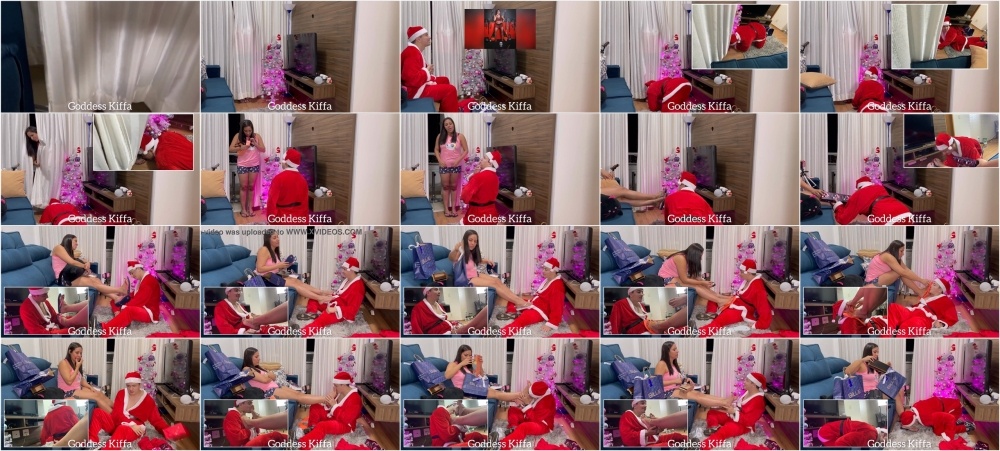 Goddess Kiffa is waiting for Santa Claus to show up on the night to leave gifts. She hides behind the curtain.Santa Shows up, and starts to choose a gift to leave on Goddess Kiffa christmas tree. But suddenly, he starts remembering all the moments where the bad girl Kiffa was…. bad! Kissing girls, fucking guys, slapping guys, stepping on them, kicking them on the balls, she was really bad! So he leaves one little gift for her. But suddenly, Santa sees a pair of feet under the curtain. He doesn't know if he is dreaming, or drinking too much. In fact, he just thinks on those feet! He starts to smell them a lot, until the Kiffa bad girl kicks him and says that she wants her gifts. She wants bigger gifts. Kiffa perceives that Santa’s cock is hard because of her feet. She doesn't lose the opportunity to trick Santa with her feet! She teases him with her sexy feet wearing flip flops. She takes a lot of gifts. She takes toe rings gifts and wears them using Santa’s face as a footstool! She steals all of Santa’s gifts. She even got a brand new iphone 12 pro max! But she slaps his face, because she wanted the Iphone 13! After getting all his gifts she lets Santa continue to worship her feet, kiss them, suck her toes, like a good Santa. But she makes him promise that next year, he will bring even MORE gifts for her!