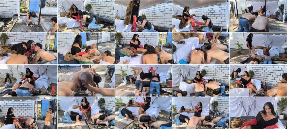 The Cruel Queen Ama K loves to have tons of slaves serving her. Today, she has instructed on of her slaves, Fauno, to bring the other captured slaves to be presented before her. She wants to have some femdom amusement with them. She will tease them, she will let them to worship her feet, She will trample them and of course, she will also whip them! All for her divine amusement!