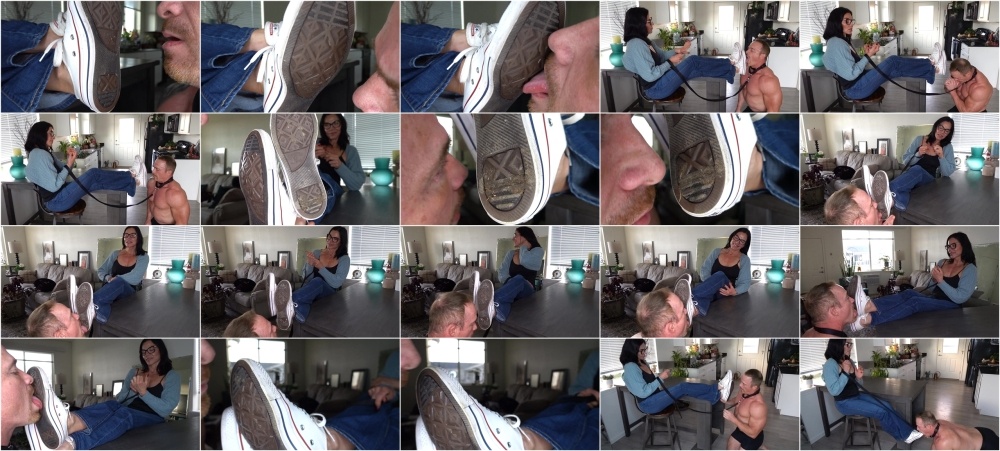 I'm relaxing throughout the clip, filing my beautiful nails while loser kneels before me on a leash. I'm going to have him lick my shoes...Just saying the words, "lick the bottom of my shoes," makes me wet and one of my favorite things to make betas do for me. And converse are my favorite sneakers--I wear this white pair at the gym, jogging at the park, shopping, running errands and going on long walks around town. No clue what I may have stepped in as I don't really pay much attention--I shouldn't have to. A Goddess should walk freely without care, enjoying her superior life and having fun, while a lowly 'lick worm' cleans the dirty soles of her shoes as a result. I get even more turned on as loser's tongue starts getting discolored and hear the grime crunching in his teeth--sometimes he even sniffs something in the treads! Wonder what it was?? HOWEVER, one of my erotic fantasies is to make a total loser lick shht off the bottom of my shoe. See that disgusting 'stuff' pressed into the heel of my right sneaker? Yep, that's shht. First, I make loser take a nice big sniff of it, then start licking it off. I can orgasm while degrading a bottom feeder like this: down on all fours like a himself, licking shht off my shoe (only question is, did I step in it on accident, or on purpose). Once my sneakers have been cleaned spotless, I tell beta to just hold the tip of my shoe in his mouth until my gfs get here--since dumbass loves this so much, I told my gfs to also step in shht!!