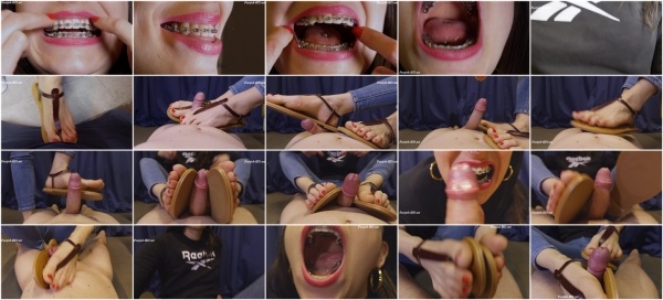 My boy left me alone and got some days off on vacation. I was at work and couldn’t let him go without having some fun. We met spontaneously at midnight and he surprised me with some sexy brown flat thong sandals. We couldn’t decide between a braces or shoejob-clip so we decided to combine both into one clip ;) First you can see sexy close-ups of my metal braces with a herbst-appliance. Enjoy the shiny look of them paired with my sexy red lips. They put quite a lot of pressure on my teeth, it always reminds me when I had braces.After teasing you with my braces you can see me wearing my brand new sandals and sexy skinny jeans. Do you like girls wearing sandals and jeans AND braces ? I use all my skills to make his cock hard. During the shoejob I also bite his cock with my braces, I could literally feel the pressure in his balls. Finally after he can’t take it anymore he shoots a HUGE load all between my foot and sandal! I just love feeling his cum on my sexy feet.
