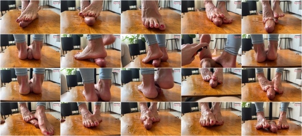 He’s locked in place — flat on his back, cock and balls exposed through the top of his cock box, completely at my mercy. I sit back on a barstool and slowly start stroking his hard cock with my bare feet, letting the tease build while I stay fully in control. He can’t move. He can’t beg. He just has to take what I give.Every so often, I stand and press my full weight into his balls with a firm, deliberate stomp — a little reminder of who’s in charge — before sitting back down and returning to the slow, sensual footjob. I shift between soft strokes and teasing pressure, working him up until I finally decide to let him release. All under my feet. All on my terms.