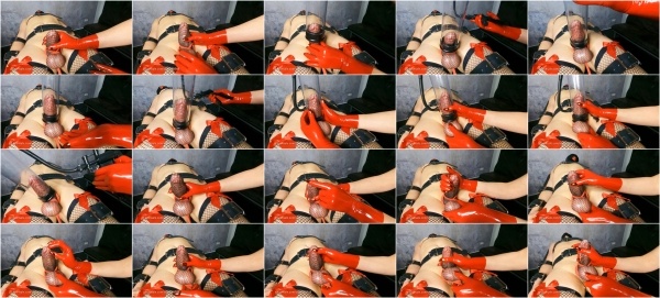 When I am content with it’s size I take off the pump and start to wank that sensitive shaft. I rub his precum with my rubber finger all over his glans. I squeeze and pump that tied cock. I press his balls with one finger and and wank his dick with my rubber gloves. After just a few hard pump he cums though the fishnet mesh and seals his fate as my sissy toy.