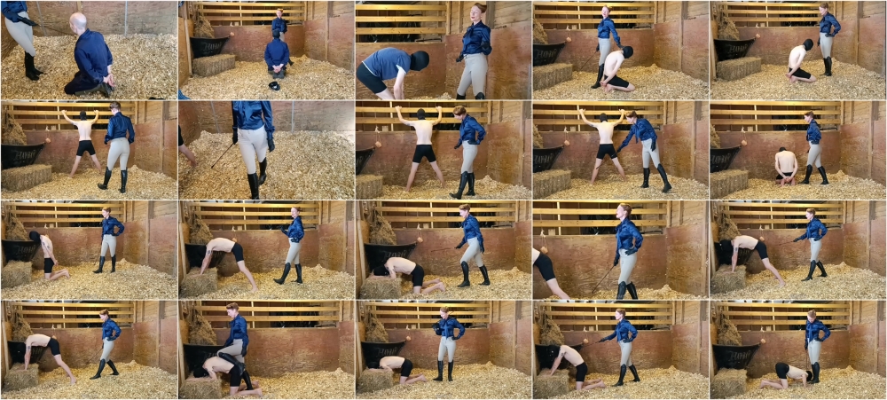 Madam M stands waiting in the stables, crop in hand. A sharp tap against her boot summons the boy from his work. He crawls in and kneels before her, sweat and filth clinging to him. She flicks his cap away with contempt—his face displeases her. The order is curt: put on your hood. Expression erased, he is reduced to function.