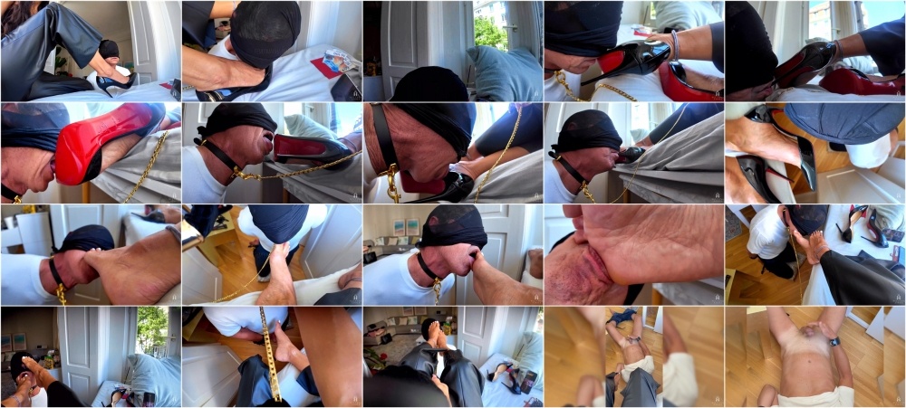 und Strafe ließ nicht lange auf sich warten.Er wusste nicht, dass ich komme.Doch ich stand plötzlich vor ihm - und war enttäuscht.Unordnung, Schlampigkeit, keine Disziplin.Ich griff sofort durch.Ich fesselte seine Arme und Beine, verband seine Augen mit meinem Nylon,setzte ihm eine Augenklappe auf und ließ ihn still knien.Er wurde zu dem, was er wirklich ist: Meine Fußablage.Dann begann das Atemspiel.Er durfte nur atmen, wenn ich es erlaubte.Jede Sekunde unter meinem Körper war eine Lektion in Demut.Doch danach…ließ ich ihn meine Louboutin-High-Heels ablecken,mit Hingabe verehren,als Zeichen echter Unterwerfung.Und schließlich:Meine nackten Füße.Er durfte sie küssen, lecken, schmecken -und erst danach,wenn ich es befohlen habe,kam er unter meiner Kontrolle.War es Erlösung?Oder nur ein weiterer Test?