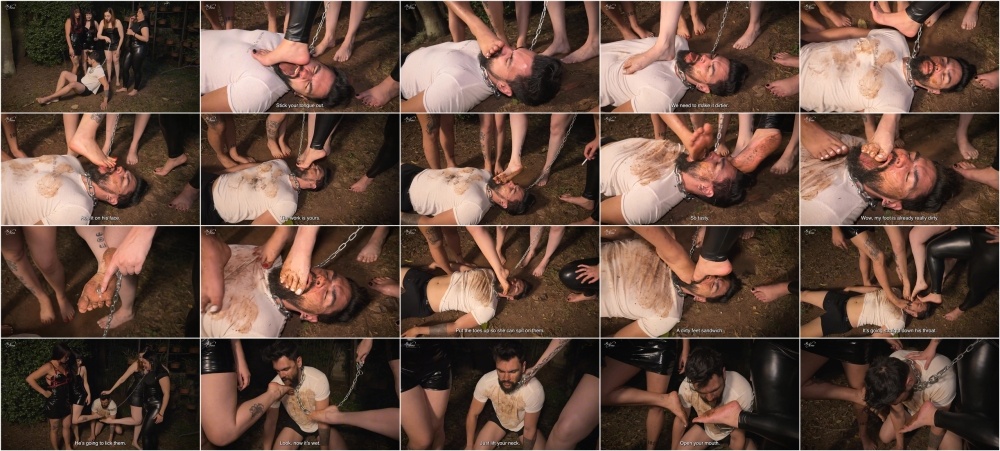 Under the cover of night, Mistress Nara, Víbora, Miss Bimby and Thay Flores drag their chained submissive Hex Fetish deep into a secluded, dirt-covered clearing. Barefoot and merciless, the four Goddesses are determined to make him taste just how filthy they can be. Their bare soles, already caked with soil, are pressed against his face, smeared across his pristine white shirt, and placed into his mouth for cleaning. They spit directly on his face, on the ground, and onto their own soles, mixing mud and saliva into a degrading paste he must lick away. As if that weren’t enough, the women smoke and flick hot ashes into his open mouth, adding to exhaustion. By the end, Hex Fetish is drenched in dirt, spit, and ash, while their soles remain so deeply filthy they’ll need hours of punishment licking to get them clean… and they already know exactly who will do it. (EN-sub) Dirty Feet - Foot Humiliation - Spitting - Human Ashtray - Slave Degradation