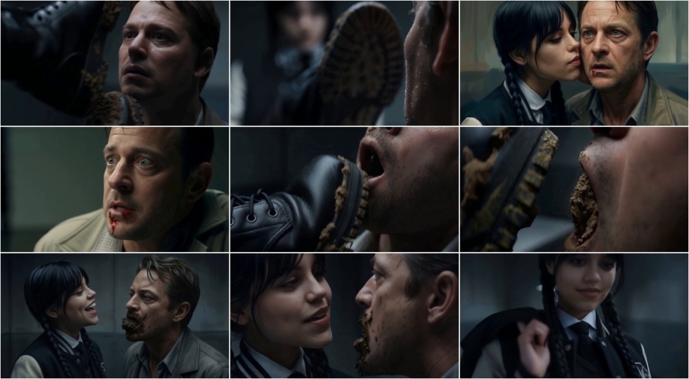 A dominant young woman, styled as a gothic Wednesday Addams cheerleader, interrogates a mesmerized suspect by teasing him with her muddy loafers. She exploits his fetish, offering intimate contact in exchange for testimony. In a cruel betrayal, she stuffs his mouth with dirt instead, reveling in triumphant laughter at his humiliation.