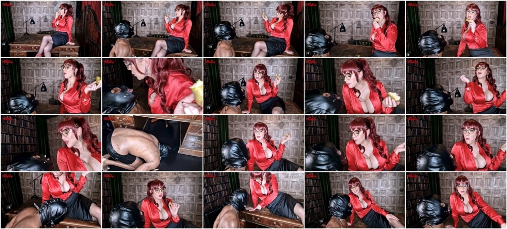 Crawling to me after carrying out his laborious chores, my slave was hungry and ready for his lunch break. But as he watches me consume this succulent pear, he just wishes he could take a bite! I am more than happy to allow this little bitch to have his lunch, but on the condition he takes his lunch second hand straight from my mouth! Once chewed and embellished with my saliva, I feed my mushy remains into his mouth like a bird feeding its chicks! Once suitably fed he is sent straight back to work!