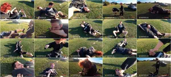 Amazing mixed wrestling beatdown, wearing black gi, outdoor, with a lot of ballbusting and foot domination foot worship action from the amazing Alexis Luna.