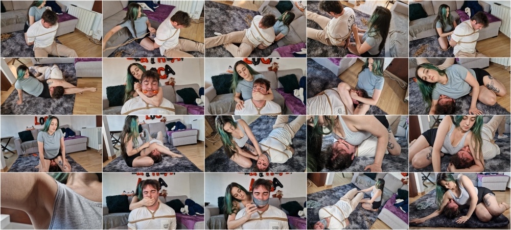 MssImperdible enters her house to find a strange man having a nap on her couch. She is not happy about that, he has not idea who’s house he dared break into, but he’s going to find out soon. She wakes him up and puts him in a really tight Rear Naked Choke, putting him on the floor. He awakens to find himself with he’s hands bound, just to immediately get tightly cleave gagged. Once he is at her mercy, MssImperdible starts having fun. She sits behind him as she chokes him with her strong hands. She then throws him on the floor and holds him down with a strong Scissor Choke. He struggles and tries to break free, but MssImperdible squeezes the life out of him. He groans in pain, but she only smiles and squeezes harder and harder. Having enough of his noises, she smothers him with her armpits, pinning down he’s head. She then climbs on top of him and, pulls her skirt up and sits on he’s face, such a comfy cushion! MssImperdible rides he’s face while smothering him, all he can about it is moan, he’s completely at her mercy. MssImperdible hasn’t had enough just yet, she takes off her t-shirt and chokes him with it, just to then sit over him again and smothers him with her breasts. He then has his air taken, yet again, by her smooth, but sweaty armpits while removing her own panties. Having been drained and having no strength left, MssImperdible stuffs her panties inside he’s mouth and securing them with a link. That’s not enough for MssImperible though, she wants a a massive gag on this guy. So she grabs some tape and wraps it around he’s head over and over and over as tightly as possible until he has a monster gag on him. Once he’s fully gagged she puts him one last time in a Rear Naked Choke and throws him on the floor, holding him down her armpit again, such a victory!