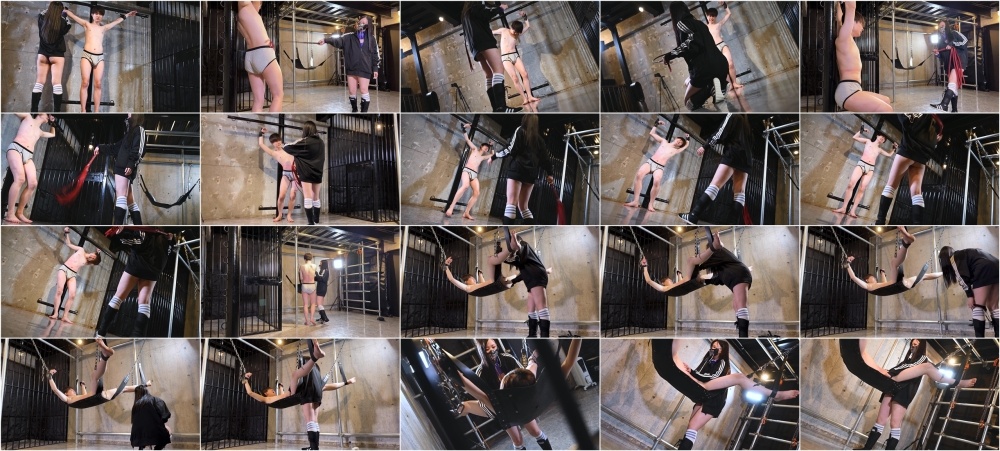 This sub seems a little skittish.But the reason could not be clearer when we see Juka come in with a whip and handcuffs. After securing her sub to the cross, she gets right into it, swinging her whip again and again and this poor guy. “Why is he screaming so much, I'm not even doing it that hard,” thinks Juka. Switching from a single-tail whip to a flogger to a cane, this guy just won't shut up. “I'll give him something to cry about” Juka thinks to herself as she releases him from the cross, strips off what little clothes her sub is wearing and rigs him up to her sex swing. Then comes the lotion. He soon realizes what is going on here, but it's too late. Juka's fingers are already up his ass! But fingers won't be the only thing entering him today. Juka prepared a special strap-on dildo just for him. Open up, here she comes!