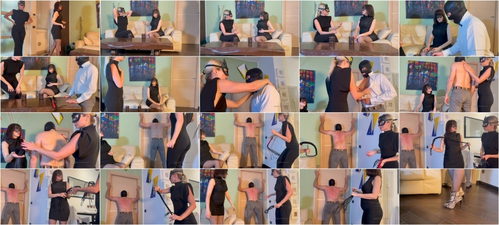 Italian speakingVado a trovare la mia amica e mi presenta il suo schiavo. È educato e servizievole, si avvicina al mio cospetto in ginocchio e bacia la mia mano con sottomissione. Mentre lo schiavo è al lavoro in cucina, io e la mia amica parliamo dei nostri sottomessi osservando che spesso fanno fatica a resistere al dolore. La mia amica mi dice che il suo schiavo è ben addestrato e mi propone di provarlo. Decido di testare la resistenza del suo corpo con la frusta, quindi gli ordino di togliersi la camicia. Lo schiavo si posiziona con la schiena nuda verso di noi e comincio a frustarlo. I colpi sono da subito forti e veloci. Lo schiavo si lascia usare da me e aumento l’intensità delle frustate. Provo diversi tipi di frusta e mi alterno con la mia amica. La sua pelle è diventata rossa ed è completamente segnata dalle frustate. Soddisfatte, congediamo lo schiavo che bacia le nostre mani in segno di devozione