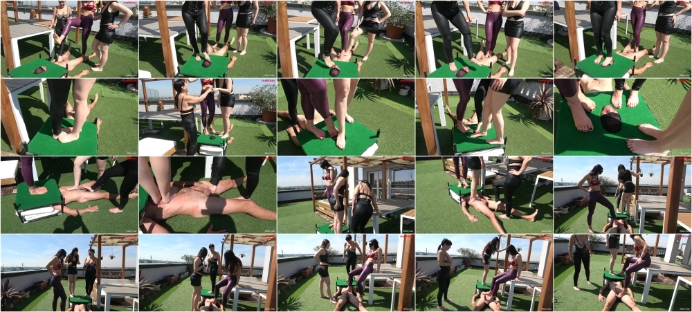 Strumento delizioso, no? Noi tre mistress abbiamo immobilizzato lo schiavo sotto questa trample box. La testa, la sua faccia di culo, spunta dal foro apposito. Il corpo è a nostra completa disposizione, il cazzo aspetta le nostre punizioni. Ma è soprattutto la faccia il nostro obiettivo. La faccia gliela schiacciamo e seppelliamo sotto i nostri piedi divini, li strofiniamo a turno mentre lui li lecca, ci saltiamo sopra addirittura. Io glieli metto addosso in modo che non possa respirare. Lo facciamo senza riguardo, con violenza, pestandolo per bene. Un massacro. Intanto però non trascuriamo il resto: una di noi a turno gli eccita o gli pesta il cazzo inutile, lo calpesta, lo usa da punching ball. Non gli diamo tregua. È un verme da calpestare schiacciandolo, niente di più.