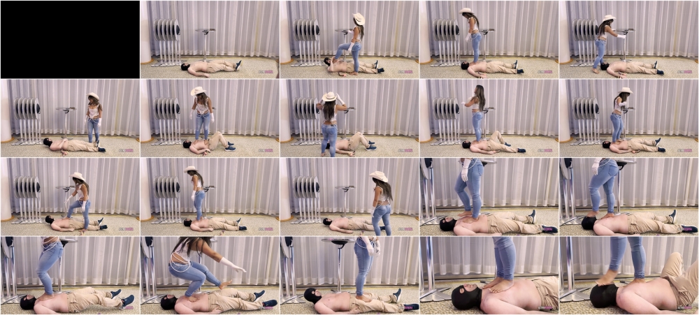 I don't care who you are or where I meet you, I will turn you into my personal doormat!Goddess Sydney is out traveling to one of her many conventions, when she came across someone calling himself the foot fetish guy. Well, she decided to put this to the test! She told him she wants to trample him right then in there and of course he thinks he's up to the challenge and agrees. Little does he know what an expert trampler she is! She loves him wearing a bandit mask since she's dressed up as a sexy cowgirl sheriff, so that just makes this all the more fitting.She has him lay down on the ground and makes him take her heels off, then steps right up on him like it was nothing. He instantly winces under her as she stomps down on him but she's just getting started. She tramples and marches over every inch of his body. Next she follows it up with some powerful hard jumps! It's almost like she's trying to flatten him completely. She tramples his face and chest and even makes him kiss her ass and feet as her carpet. Is he even going to survive this trampling? If he does, it'll definitely be a session to remember!